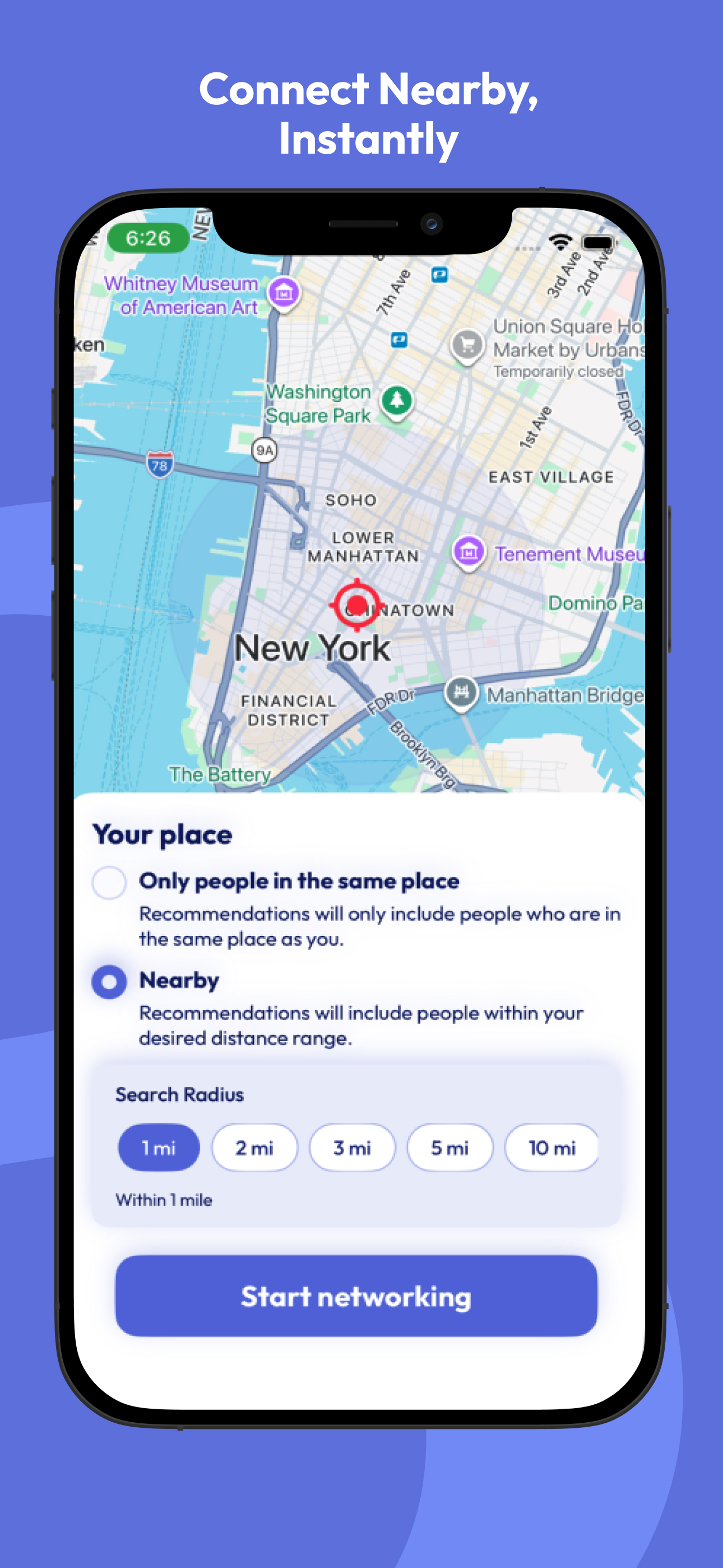 Built for authentic real-world connections. Set your intentions, craft the perfect pitch, and find your next big connection nearby.